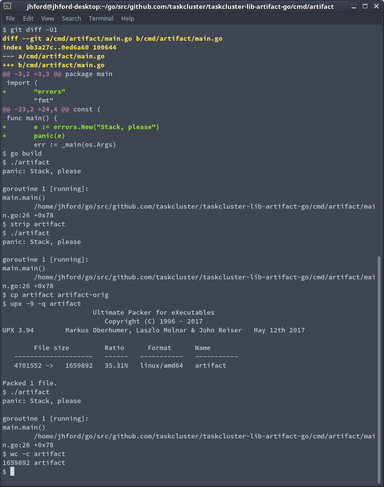 go get -u -t -v github.com/taskcluster/taskcluster-lib-artifact-go cd $GOPATH/src/github.com/taskcluster/taskcluster-lib-artifact-go git checkout 6f133d8eb9ebc02cececa2af3d664c71a974e833 time (go build) && wc -c ./artifact time (go build && strip ./artifact) && wc -c ./artifact time (go build -ldflags="-s") && wc -c ./artifact time (go build -ldflags="-w") && wc -c ./artifact time (go build -ldflags="-s -w") && wc -c ./artifact time (go build && upx -1 ./artifact) && wc -c ./artifact time (go build && upx -9 ./artifact) && wc -c ./artifact time (go build && strip ./artifact && upx -1 ./artifact) && wc -c ./artifact time (go build && strip ./artifact && upx --brute ./artifact) && wc -c ./artifact time (go build && strip ./artifact && upx --ultra-brute ./artifact) && wc -c ./artifact time (go build && strip && upx -9 ./artifact) && wc -c ./artifact